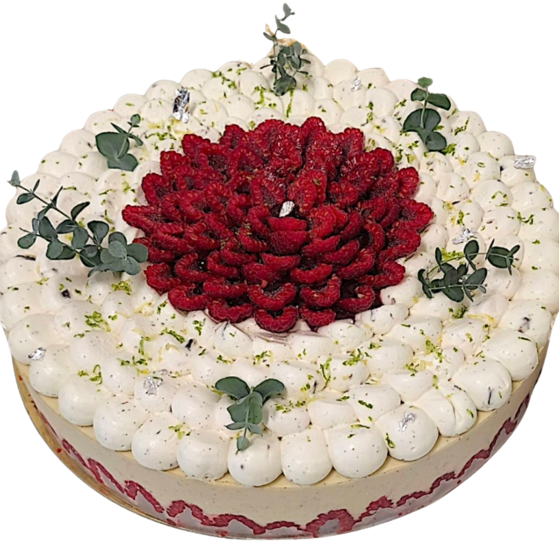 Biscuit moelleux aux amandes grillées concassées, gel framboise et citron vert, framboises fraîches entières , crème bonbon vanille, chantilly vanille.