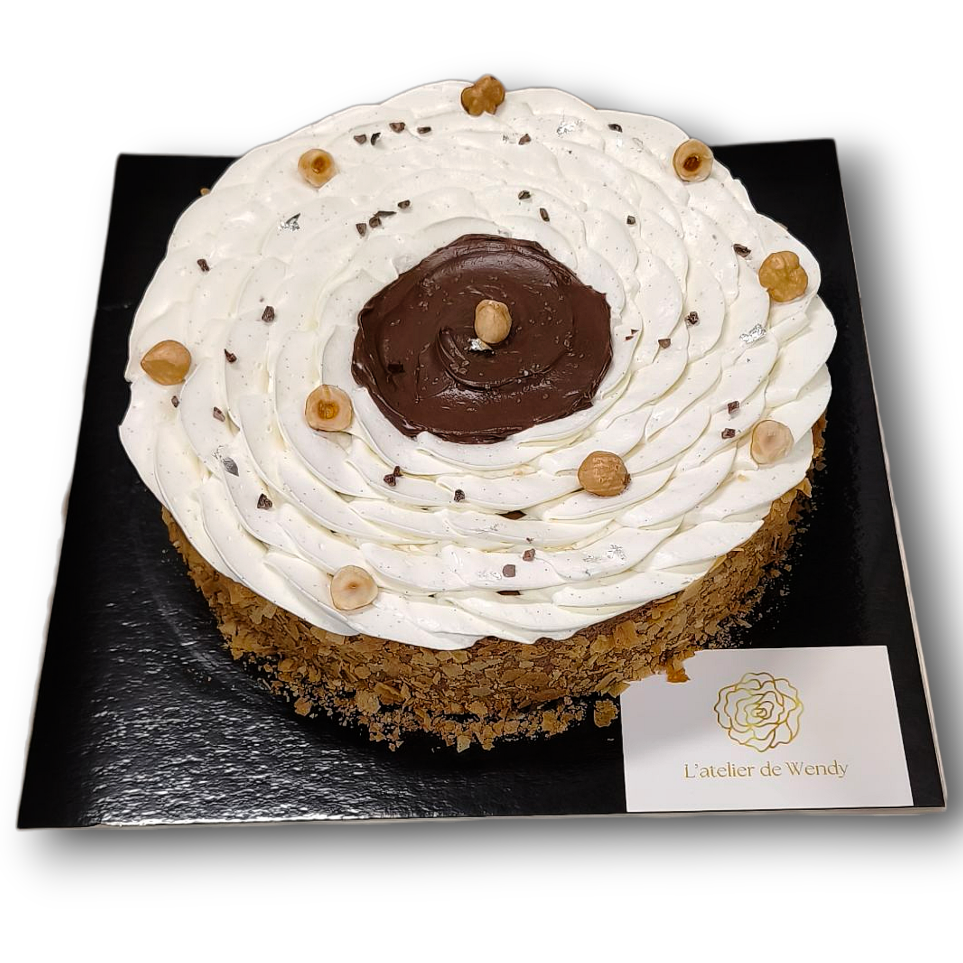 Biscuit meringué amande noisette, croustillant praliné noisette, mousse onctueuse chocolat noir 55%, chantilly vanille, noisettes grillées.